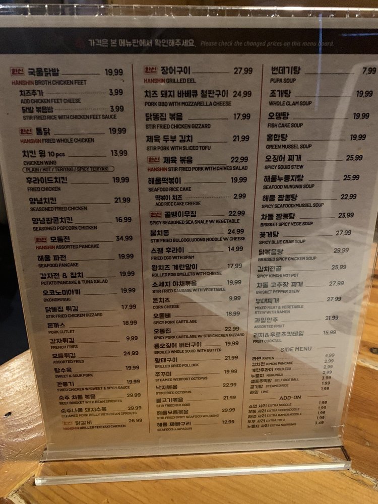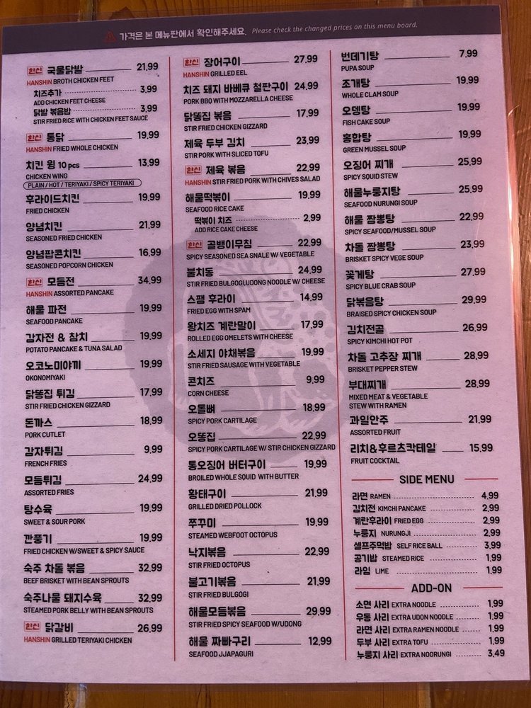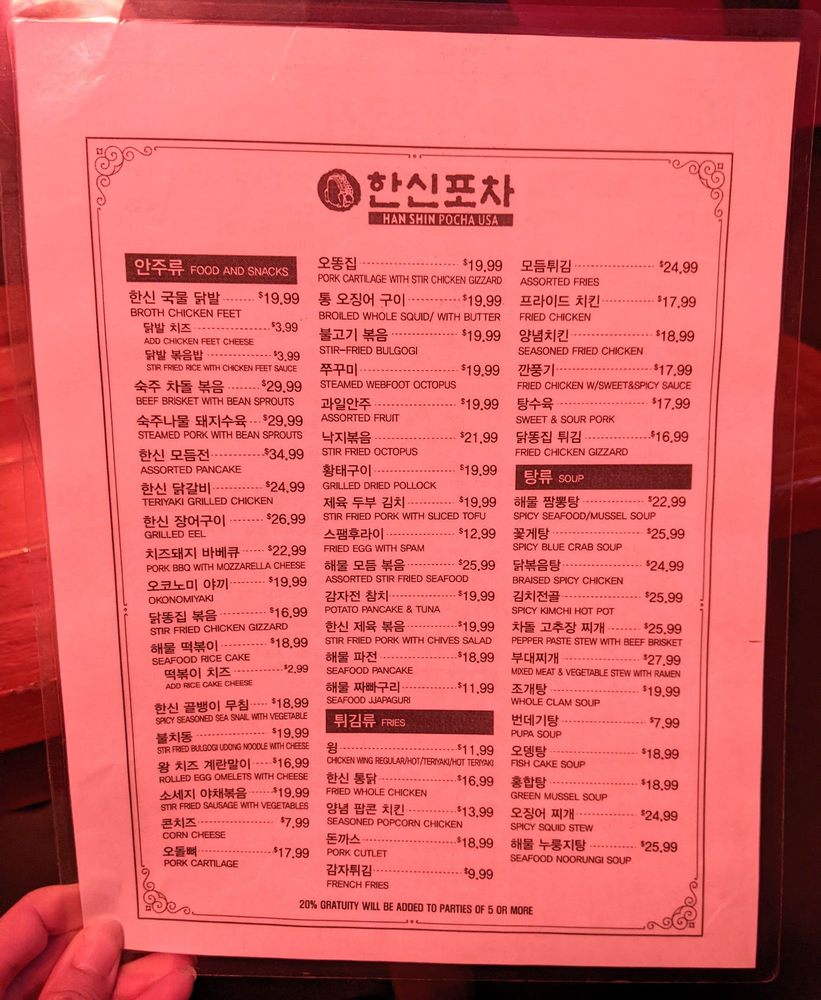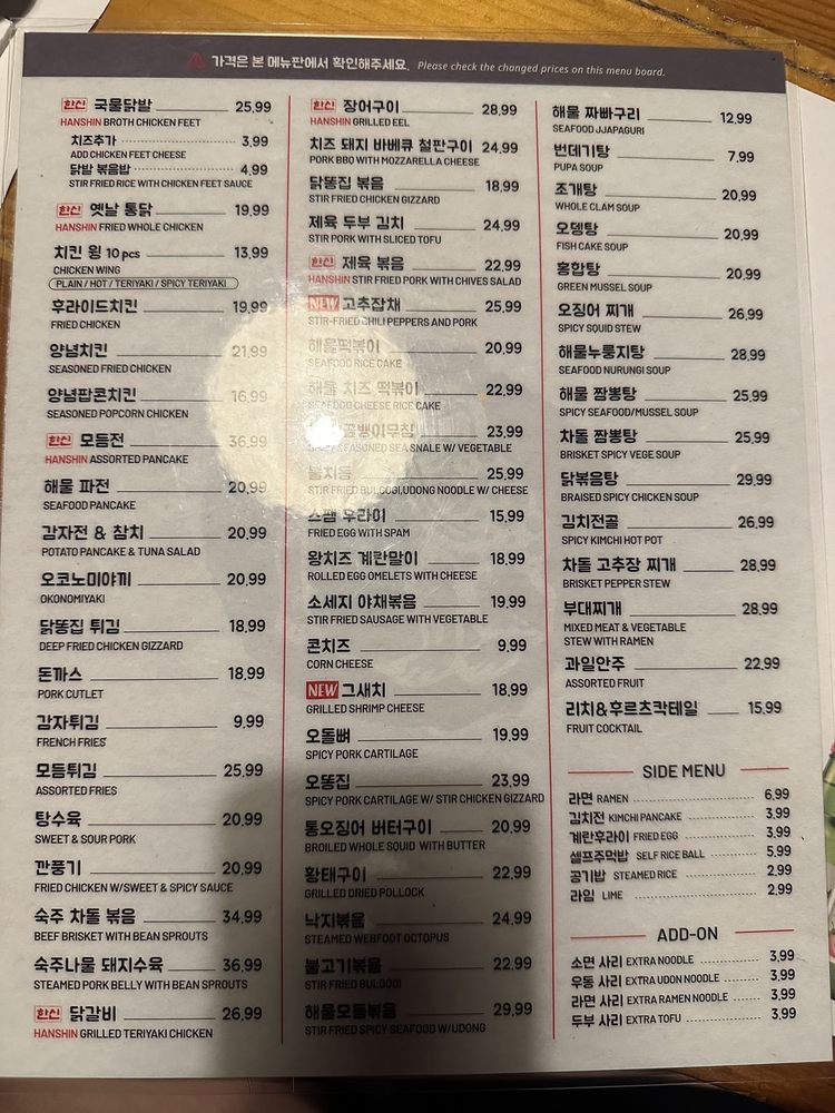 Introducing the menu at The Pocha Hanshin, a lively Korean karaoke spot in Duluth, GA, known for its delicious comfort food and vibrant atmosphere. Customers rave about the spicy chicken feet, bossam, sweet & sour pork, seafood udon, and crispy Korean fried chicken. The squid is tender, the sweet and sour pork is crispy and flavorful, and the seafood stew is rich and spicy. The menu also offers options like blanched napa cabbage, bean sprout soup, and egg & cheese omelette. The diverse dishes, attentive service, and vibrant ambiance make this a must-visit for anyone craving authentic Korean pocha cuisine. Whether you're looking to enjoy a casual get-together or a fun night out with friends, The Pocha Hanshin offers a delicious dining experience with a variety of food and drink options to suit every palate.